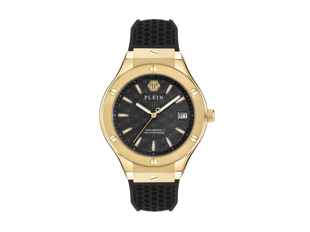 HODINKY PHILIPP PLEIN MAN PWUFA0225 (44MM). Typ mechanizmu: QUARTZ. Displej: HODINKY: ANALÓGOVÉ. Materiál puzdra: MATERIÁL: NEHRDZAVEJÚCA OCEĽ. Farba puzdra: FARBA: ZLATÁ. Materiál náramku: MATERIÁL NÁRAMKU: SILIKÓN. Farba náramku: FARBA NÁRAMKU: ČIERNA. Farba ciferníka: ČIERNA. Typ skla: MINERÁLNE. Kľučka: BUCKLE. Priemer ciferníka: dĹŽKA CIFERNÍKA: 44MM. Ponoriteľnosť: 5 ATM