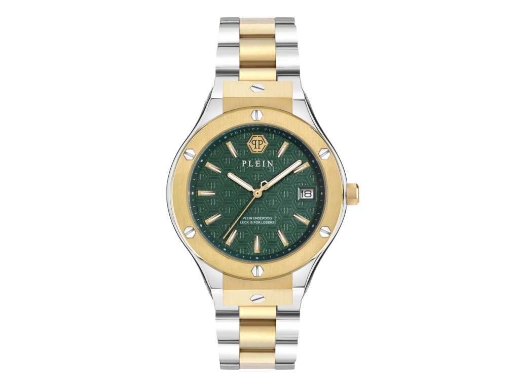 HODINKY PHILIPP PLEIN MAN PWUFA0525 (44MM). Typ mechanizmu: QUARTZ. Displej: HODINKY: ANALÓGOVÉ. Materiál puzdra: MATERIÁL: NEHRDZAVEJÚCA OCEĽ. Farba puzdra: FARBA: ZLATÁ. Materiál náramku: MATERIÁL NÁRAMKU: NEHRDZAVEJÚCA OCEĽ. Farba náramku: ZLATÁ. Farba ciferníka: ZELENÁ. Typ skla: SKLÍČKO: MINERÁLNE. Sklo: TLAK. Priemer ciferníka: dĹŽKA CIFERNÍKA: 44MM. Ponoriteľnosť: 5 ATM