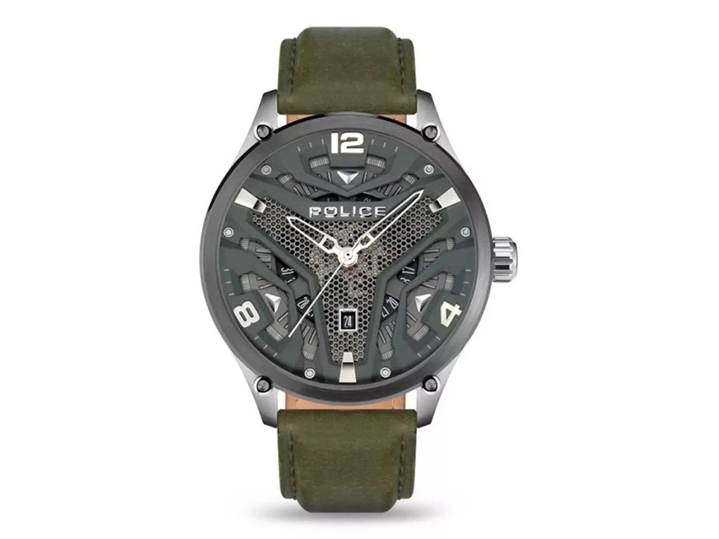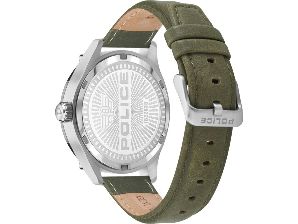 HODINKY POLICE MAN PEWJB2203042 (52MM). Typ mechanizmu: QUARTZ. Displej: DISPLEJ: ANALÓGOVÝ. Materiál puzdra: MATERIÁL: NEHRDZAVEJÚCA OCEĽ. Farba puzdra: FARBA PUZDRA: ŠEDÁ. Materiál náramku: MATERIÁL NÁRAMKU: KOŽA. Farba náramku: FARBA NÁRAMKU: ZELENÁ. Farba ciferníka: FARBA CIFERNÍKA: ŠEDÁ. Typ skla: SKLÍČKO: MINERÁLNE. Kľučka: BUCKLE. Priemer ciferníka: dĹŽKA CIFERNÍKA: 52MM. Ponorný: NE