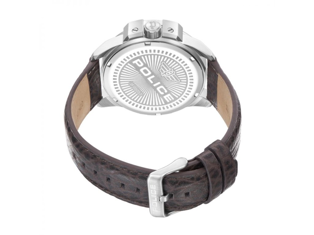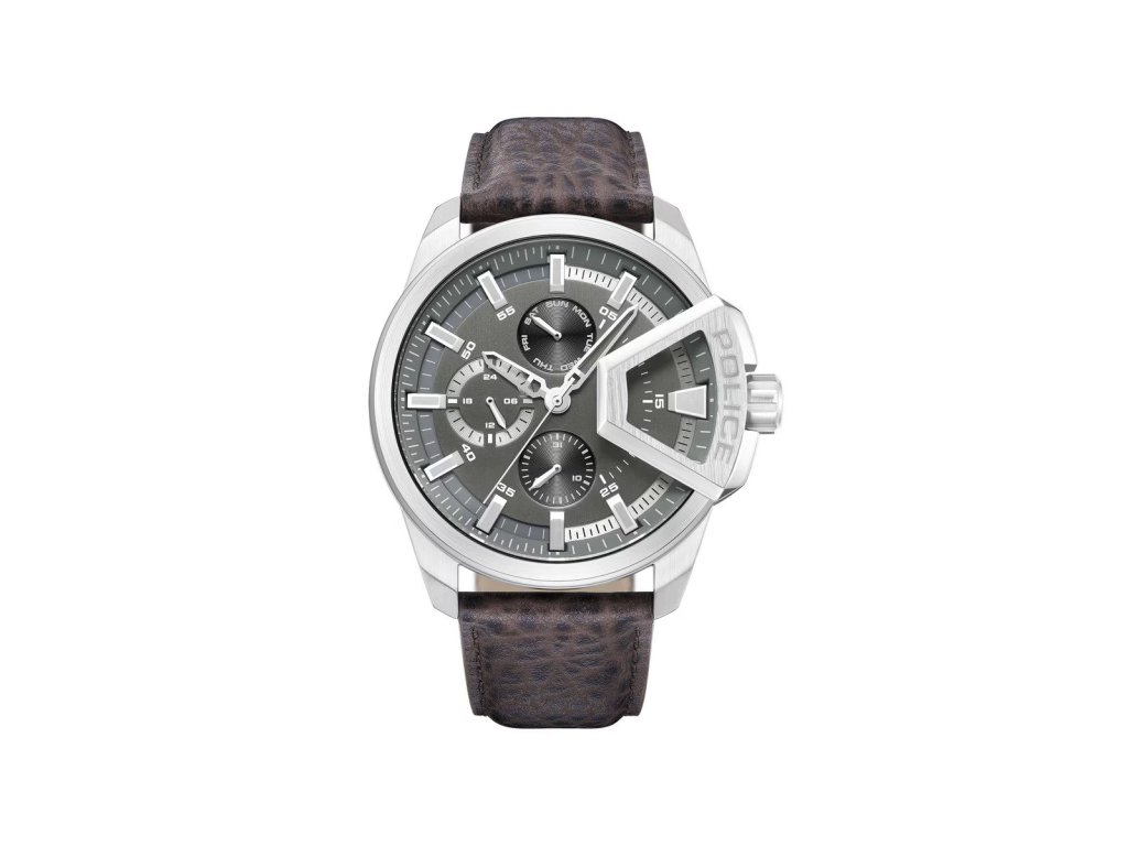 HODINKY POLICE MAN PEWJF0005703 (46MM). Typ mechanizmu: QUARTZ. Displej: DISPLEJ: ANALÓGOVÝ. Materiál puzdra: MATERIÁL: NEHRDZAVEJÚCA OCEĽ. Farba puzdra: FARBA PUZDRA: ŠEDÁ. Materiál náramku: MATERIÁL NÁRAMKU: KOŽA. Farba náramku: FARBA NÁRAMKU: HNEDÁ. Farba ciferníka: FARBA CIFERNÍKA: ŠEDÁ. Typ skla: SKLÍČKO: MINERÁLNE. Kľučka: BUCKLE. Priemer ciferníka: dĹŽKA CIFERNÍKA: 46MM. Ponorný: 5ATM