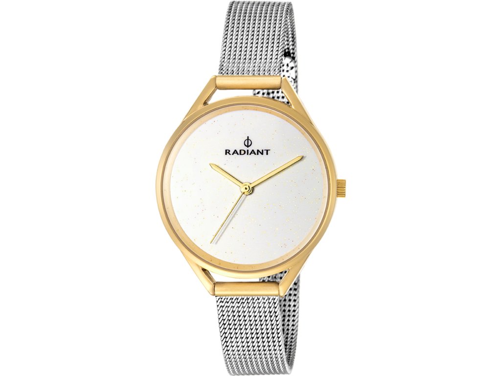 HODINKY RADIANT WOMAN RA432202 (34MM). Typ mechanizmu: QUARTZ. Displej: HODINKY: ANALOGICO. Materiál puzdra: MATERIÁL PUZDRA: OCEĽ. Farba puzdra: FARBA PUZDRA: ZLATÁ. Materiál náramku: MATERIÁL NÁRAMKU: OCEĽ. Farba náramku: STRIEBORNÁ FARBA NÁRAMKU. Farba ciferníka: BIELA. Typ skla: SKLÍČKO: MINERÁLNE. Clousure: TLAK. Priemer ciferníka: dĹŽKA CIFERNÍKA: 34 MM. Ponorný: 5ATM