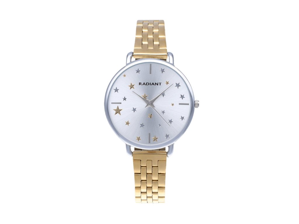 HODINKY RADIANT WOMAN RA544202 (38MM). Typ mechanizmu: QUARTZ. Displej: HODINKY: ANALÓGOVÉ. Materiál puzdra: MATERIÁL PUZDRA: KOV. Farba puzdra: STRIEBORNÁ: FARBA PUZDRA: STRIEBORNÁ. Materiál náramku: MATERIÁL NÁRAMKU: OCEĽ. Farba náramku: FARBA NÁRAMKU: ZLATÁ. Farba ciferníka: STRIEBORNÁ. Typ skla: SKLÍČKO: MINERÁLNE. Clousure: TLAK. Priemer ciferníka: dĹŽKA CIFERNÍKA: 38 MM. Ponorný: pÔSOBENIE: 3 ATM