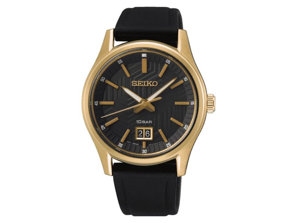 HODINKY SEIKO MAN SUR560P1 (39,5MM). Typ mechanizmu: QUARTZ. Displej: TYP: ANALÓGOVÝ. Materiál puzdra: MATERIÁL: NEHRDZAVEJÚCA OCEĽ. Farba puzdra: FARBA: ZLATÁ. Materiál náramku: MATERIÁL NÁRAMKU: SILIKÓN. Farba náramku: FARBA NÁRAMKU: ČIERNA. Farba ciferníka: ČIERNA. Typ skla: TYP SKLA: HARDLEX. Kľučka: BUCKLE. Priemer ciferníka: dĹŽKA CIFERNÍKA: 39,5 MM. Ponoriteľnosť: 10ATM