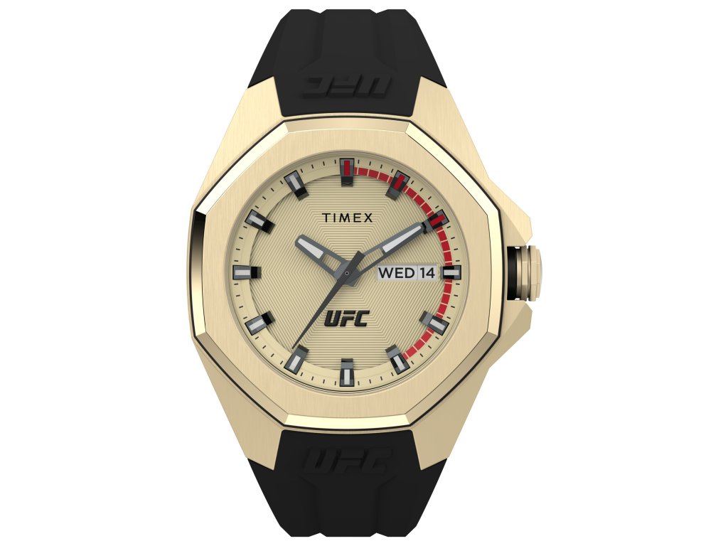 HODINKY TIMEX MAN TW2V57100 (44MM). Typ mechanizmu: QUARTZ. Displej: HODINKY: ANALÓGOVÉ. Materiál puzdra: MATERIÁL: NEHRDZAVEJÚCA OCEĽ. Farba puzdra: FARBA: ZLATÁ. Materiál náramku: MATERIÁL NÁRAMKU: SILIKÓN. Farba náramku: FARBA NÁRAMKU: ČIERNA. Farba ciferníka: FARBA CIFERNÍKA: ZLATÁ. Typ skla: SKLÍČKO: MINERÁLNE. Kľučka: BUCKLE. Priemer ciferníka: dĹŽKA CIFERNÍKA: 44MM. Ponoriteľnosť: 10 ATM
