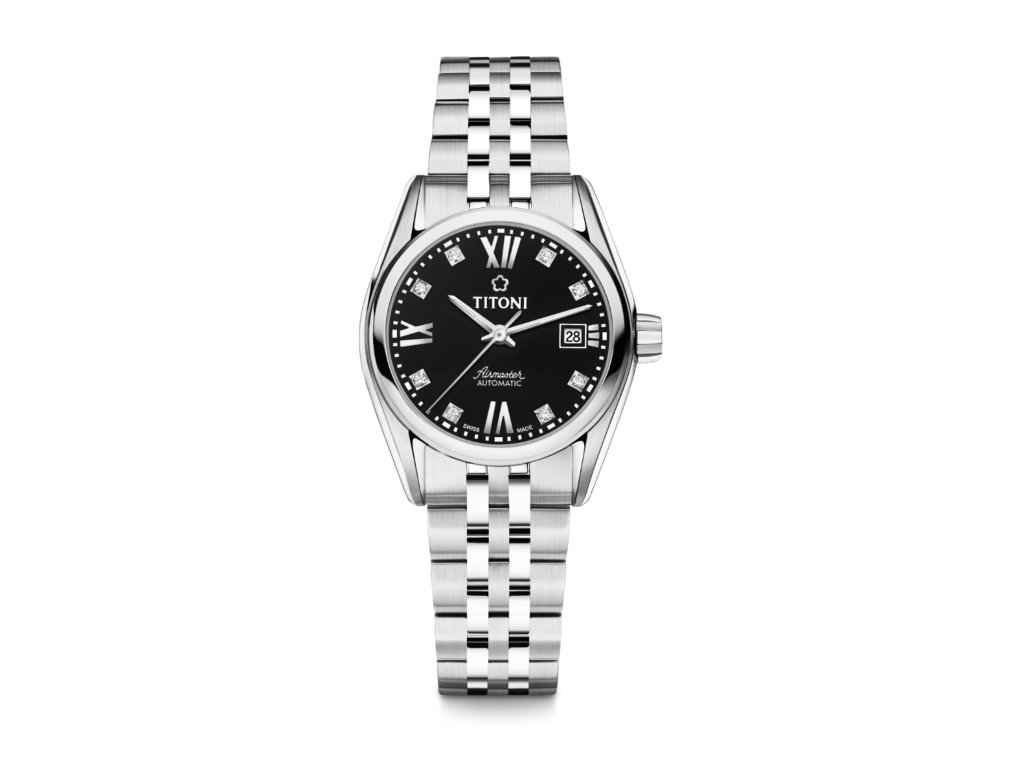 HODINKY TITONI WOMAN 23909S-354 (27MM). Typ mechanizmu: TYP: AUTOMATICKÉ. Displej: TYP: ANALÓGOVÝ. Materiál puzdra: MATERIÁL: NEREZOVÁ OCEĽ. Farba puzdra: FARBA PUZDRA: ŠEDÁ. Materiál náramku: MATERIÁL NÁRAMKU: NEHRDZAVEJÚCA OCEĽ. Farba náramku: FARBA NÁRAMKU: ŠEDÁ. Farba ciferníka: ČIERNA. Typ skla: TYP SKLA: SAPPHIRE. Clousure: TLAK. Priemer ciferníka: dĹŽKA CIFERNÍKA: 27 MM. Ponorný: dĹŽKA: 3ATM