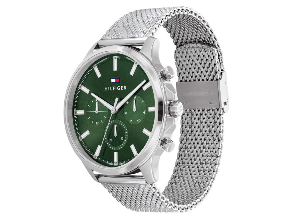 HODINKY TOMMY HILFIGER MAN 1710499 (44MM). Typ mechanizmu: QUARTZ. Displej: HODINKY: ANALOGICKÉ. Materiál puzdra: MATERIÁL: NEHRDZAVEJÚCA OCEĽ. Farba puzdra: FARBA PUZDRA: ŠEDÁ. Materiál náramku: MATERIÁL NÁRAMKU: SILIKÓN. Farba náramku: FARBA NÁRAMKU: ŠEDÁ. Farba ciferníka: FARBA CIFERNÍKA: ZELENÁ. Typ skla: SKLÍČKO: MINERÁLNE. Kľučka: BUCKLE. Priemer ciferníka: dĹŽKA CIFERNÍKA: 44MM. Ponorný: 5ATM