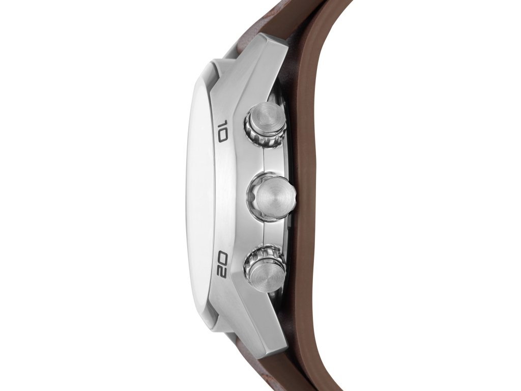 Stredne veľký čierny ciferník s priemerom 44 mm je zasadený do okrúhleho strieborného puzdra s masívnejším charakterom z ušľachtilej ocele. Vytvára vizuálne pôsobivú kombináciu s hnedým koženým remienkom. Ciferník je vybavený aj chronografom, dátumovkou, jednoduchými indexmi v žltej farbe a štýlovými ručičkami v bielej farbe. Okrem toho sú hodinkyodolné a pohodlné na každodenné nosenie. Sú preto ideálnou voľbou pre mužov, ktorí túžia po skutočne funkčnom kúsku.