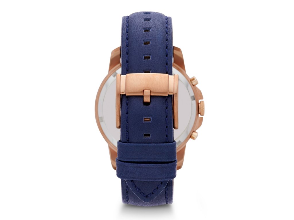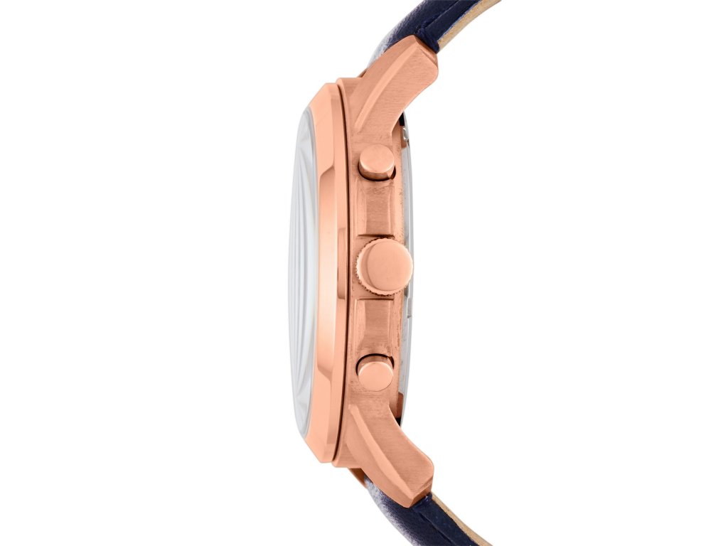 Stredne veľký modrý ciferník s priemerom 44 mm je zasadený do okrúhleho puzdra z nehrdzavejúcej ocele v ružovom zlate. Kožený remienok rovnakej farby potomdodáva hodinkám jedinečný vzhľad a prirodzený a nadčasový prvok.. Na ciferníku sú moderné ručičky, logo, ale predovšetkým indexy v podobe rímskych číslic a chronograf.