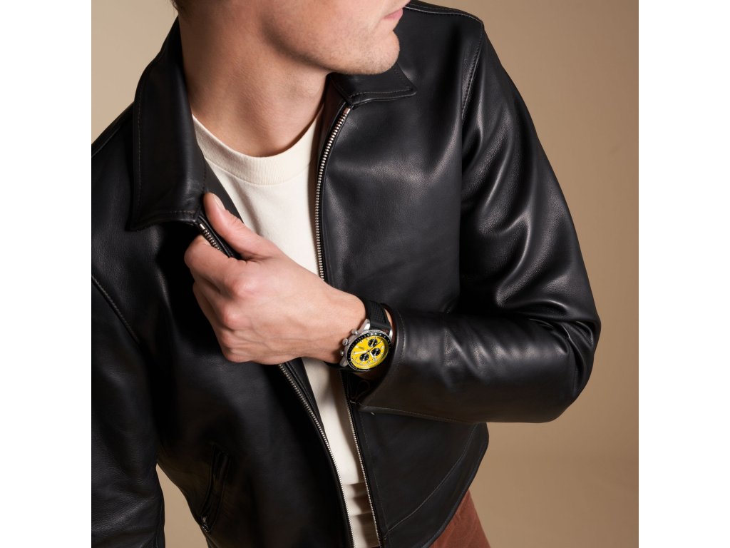 Stredne veľký žltý ciferník s priemerom 42 mm je zasadený do puzdra z nehrdzavejúcej ocele striebornej farby. Ciferník je vybavený modernými indexmi a modernými ručičkami s pevnejším charakterom, ktoré sú pokryté luminiscenčnou vrstvou, ktoráuľahčuje orientáciu aj pri slabom osvetlení. Nechýba ani ukazovateľ dátumu, chronograf a tachymeter. Silikónový remienok potom dodáva hodinkám úplne jedinečný vzhľad a zaručuje maximálne pohodlie pri nosení.