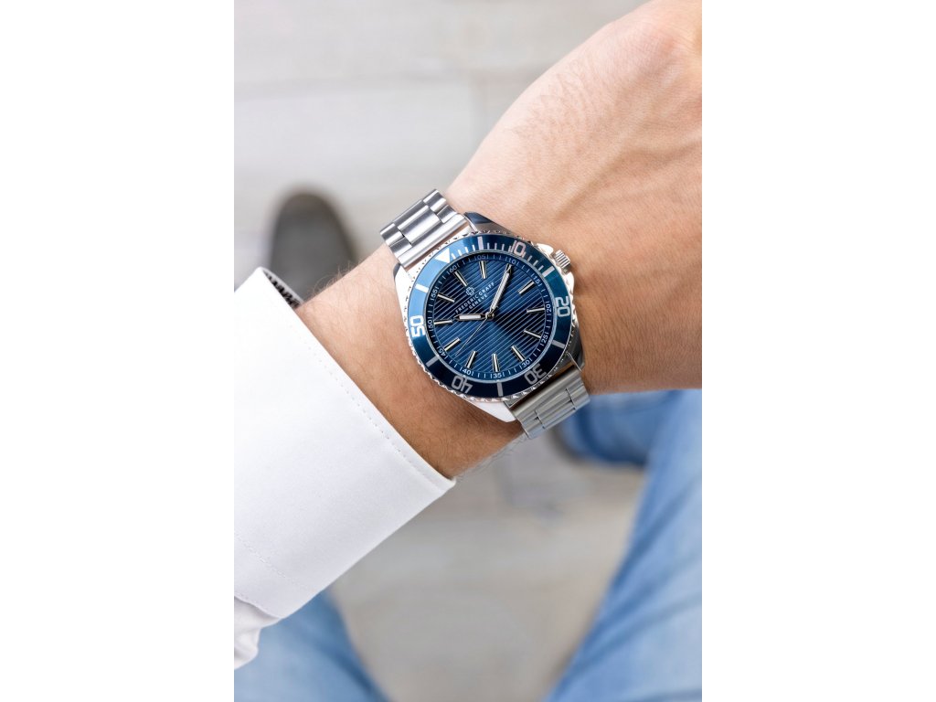 Modrý číselník dodáva hodinkám svieži a moderný vzhľad, zatiaľ čooceľový ťah v striebornej farbe zaručuje odolnosť a pohodlie pri nosení.Okrúhle puzdro v striebornom odtieni harmonicky spája všetky prvky dizajnu. Minerálne sklo chráni ciferník pri každodennom používaní. Tento model je ideálny pre mužov, ktorí chcú skombinovať tradičný kovový vzhľad s originálnym farebným prvkom.