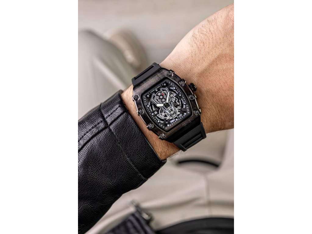 Čierny ciferník v tvare štvorca v súlade spuzdro v čiernej farbe a dopĺňa jučierny silikónový remienokktoré sú odolné a pohodlné na zápästí. Minerálne sklo chráni ciferník počas každodenného nosenia. Tento model je ideálny pre mužov, ktorí hľadajú kombináciu moderného dizajnu, praktickosti a jednoduchosti.