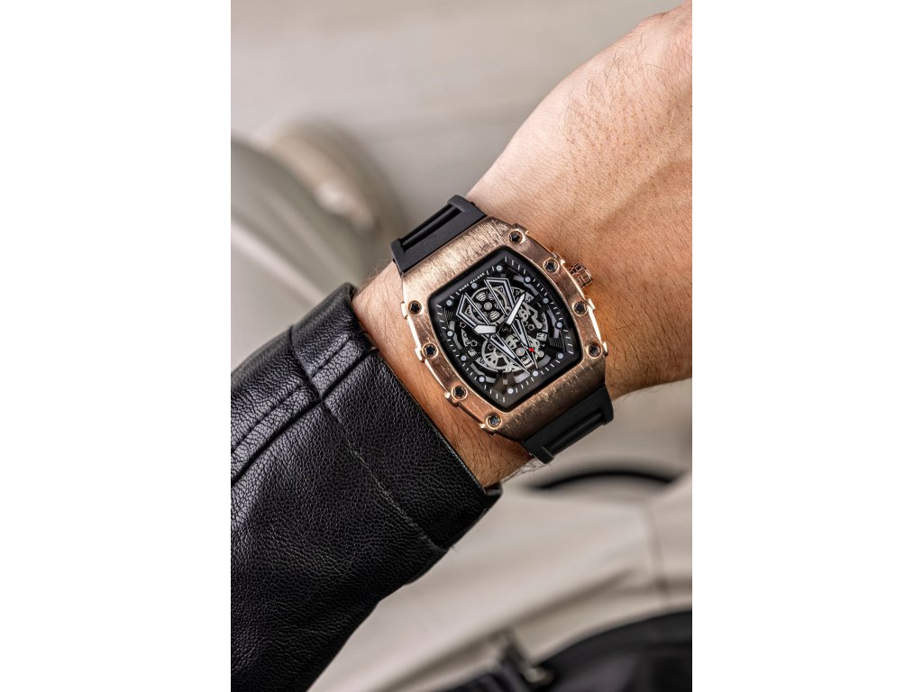 Výrazný čierny ciferník harmonicky sa spája sčierny silikónový remienokktoré sú odolné a pohodlné na celodenné nosenie.Štvorcové puzdro v tóne ružového zlata dodáva hodinkám luxusný charakter a moderný vzhľad. Minerálne sklo chráni ciferník počas každodenného používania. Tento model je ideálny pre mužov, ktorí chcú spojiť športovú funkčnosť s prémiovým dizajnom.
