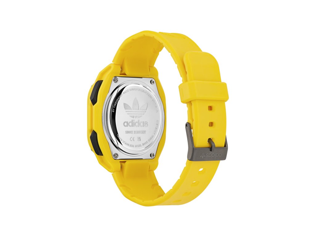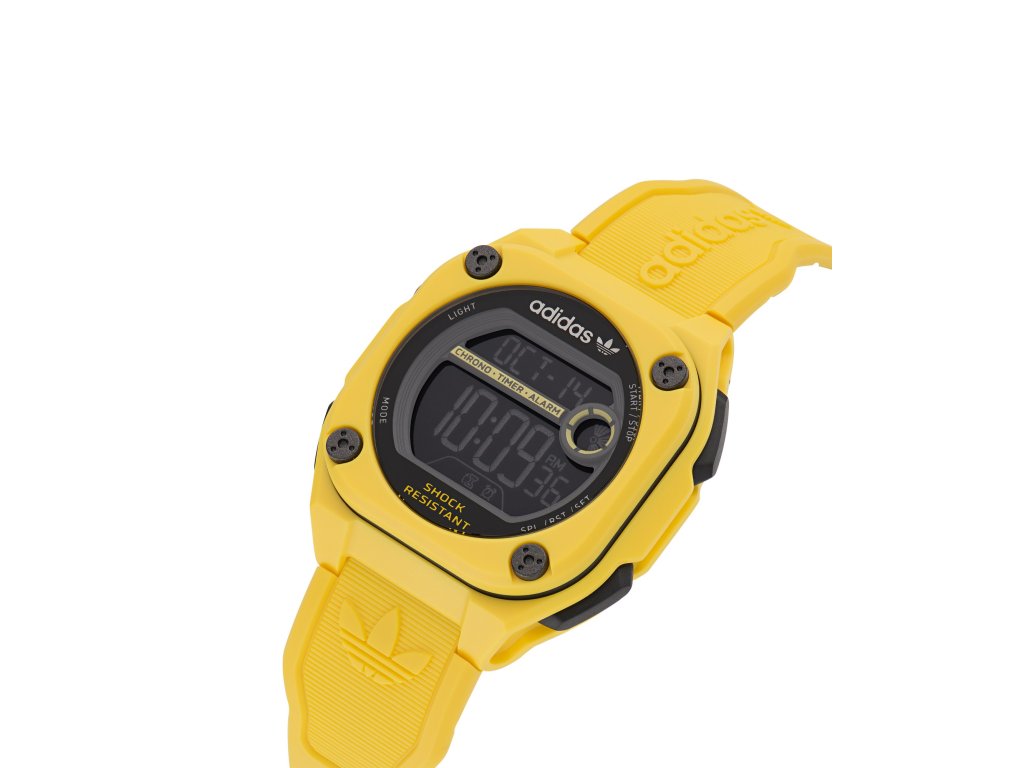 Unisex digitálne hodinky Adidas City Tech One AOST23060 zaujmú svojourobustný dizajn a kontrastná kombinácia čierneho displeja a žltého silikónového remienka. Hranaté plastové puzdro dodáva modelu výraznú dynamiku.