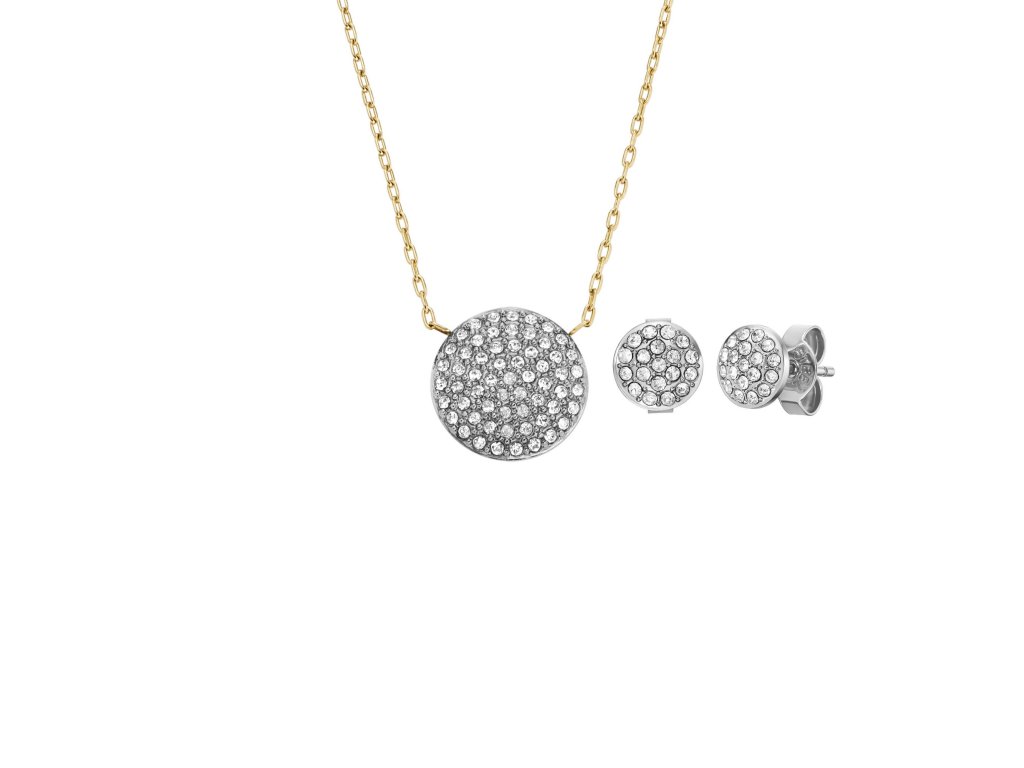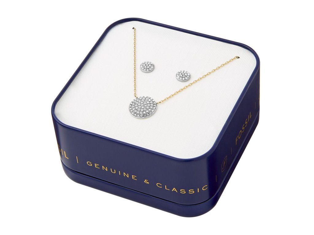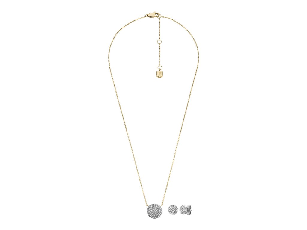 Dámska darčeková súprava Fossil prináša modernú eleganciu v podobe náhrdelníka a náušníc.Kombinácia zlata a striebra dodáva súprave originálny dvojfarebný efekt, ktorý je atraktívny a ľahko kombinovateľný s rôznymi outfitmi.