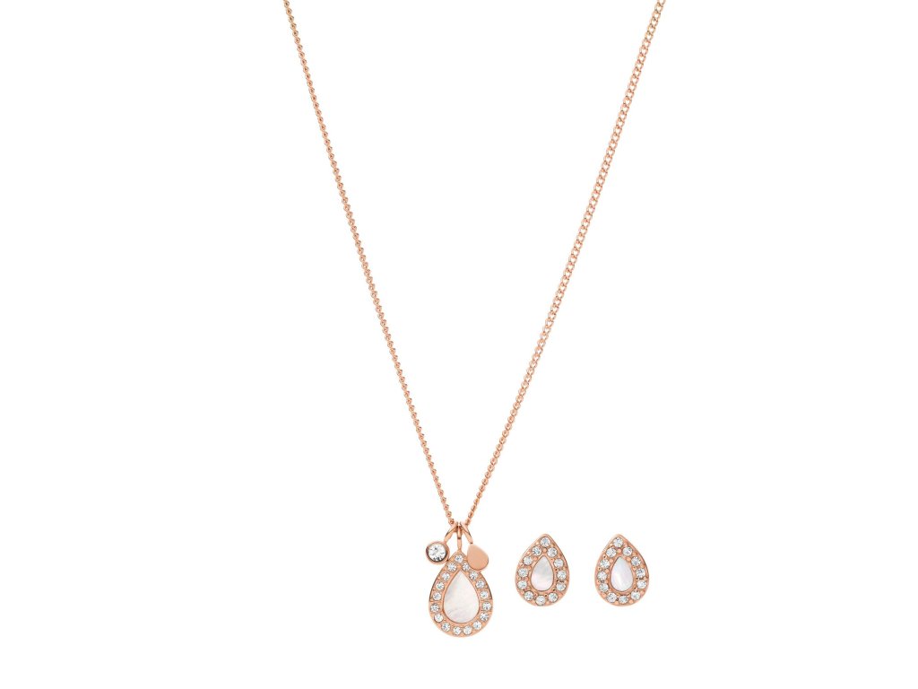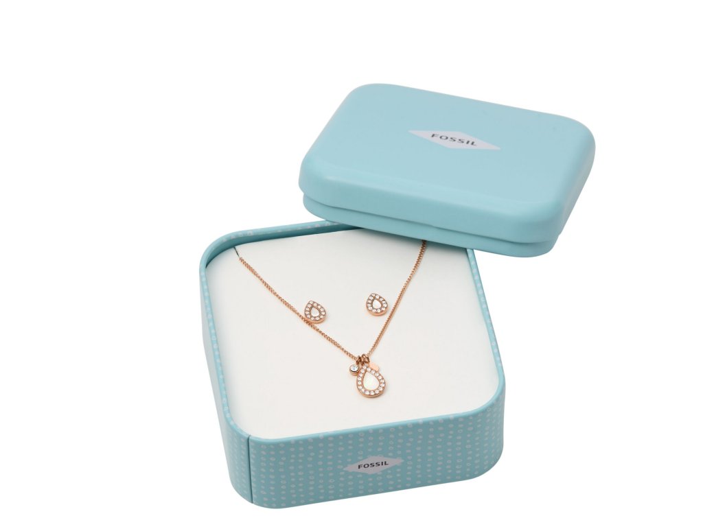 Dámska darčeková súprava Fossil spája jemnú eleganciu s moderným dizajnom. Náhrdelník a náušnice súzdobené perlami a čírymi kryštálmiktoré vytvárajú harmóniu jemného lesku a sofistikovaného trblietania.