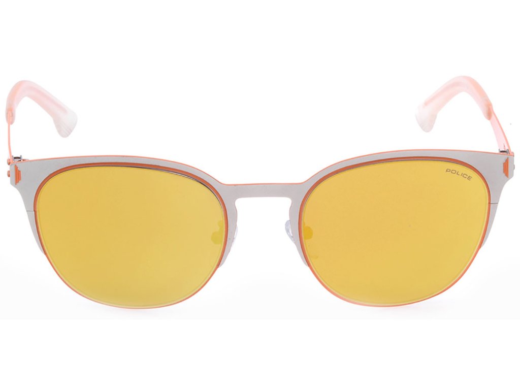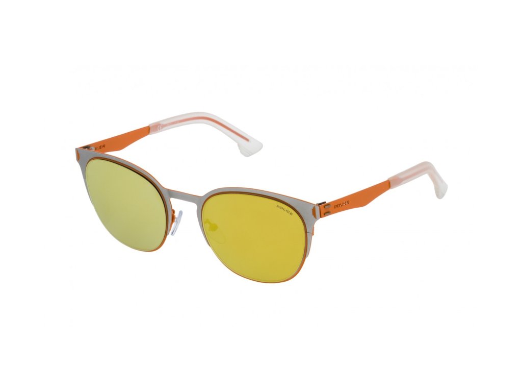 SLNEČNÉ OKULIARE POLICE Unisex SPL341-S34G (Šošovky/Mostík/Tempel) 52/21/145 mm). Materiál: MATERIÁL: KOV. Farba: strieborná - oranžová. Rozmery (šošovka/mostík/tempor): 1,5 mm: 52/21/145 mm. Oranžové zrkadlo. Kategória 3 - vyrobené v Taliansku